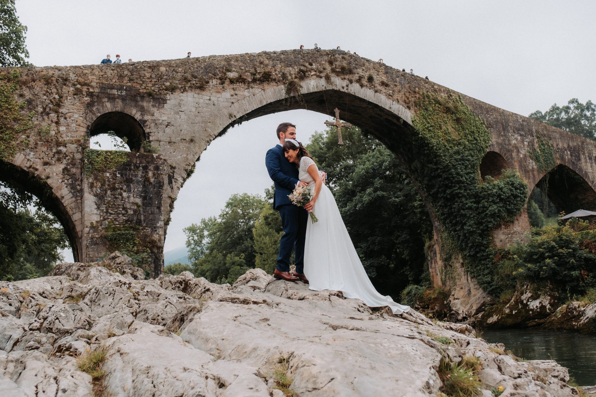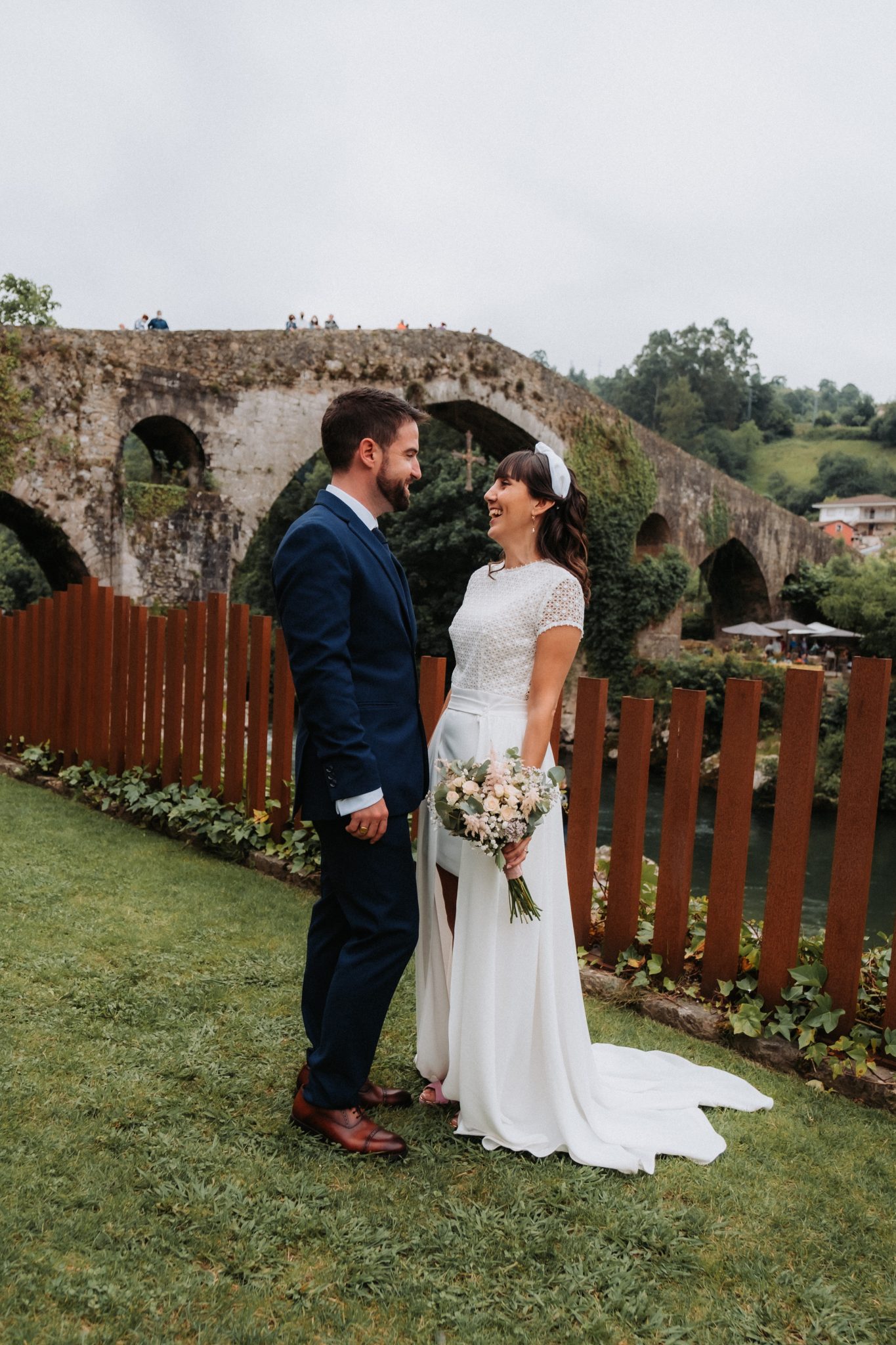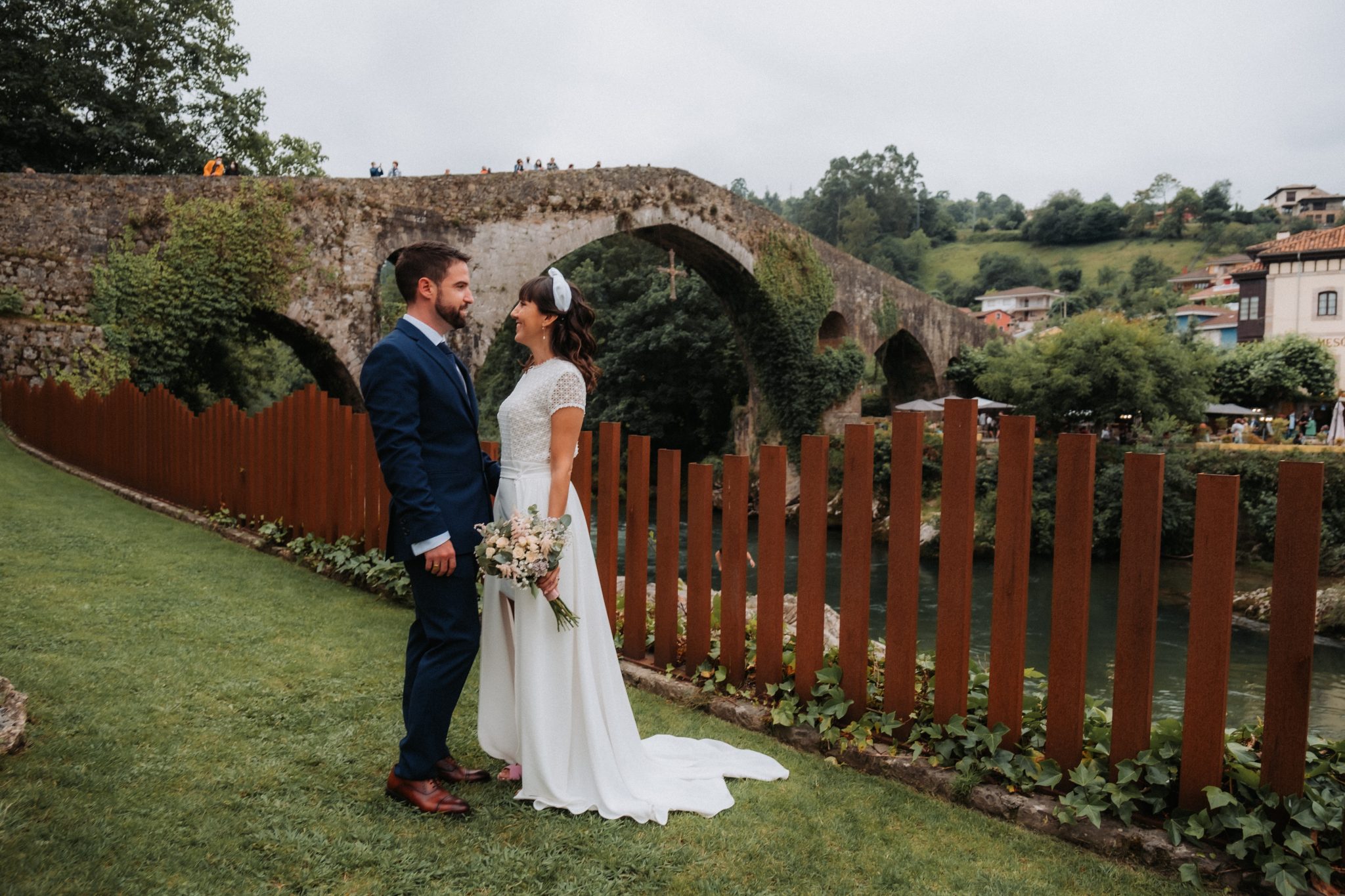 Entre medias del cóctel y la cena, hicimos una escapada para hacer unas fotos de recién casados con el puente romano de Cangas de Onís de fondo. No me gusta robar mucho tiempo pero sí me gusta que esas fotos se hagan. No me vale lo de «no se posar», todos tenemos esa mirada y esa sonrisa que ese día sale.