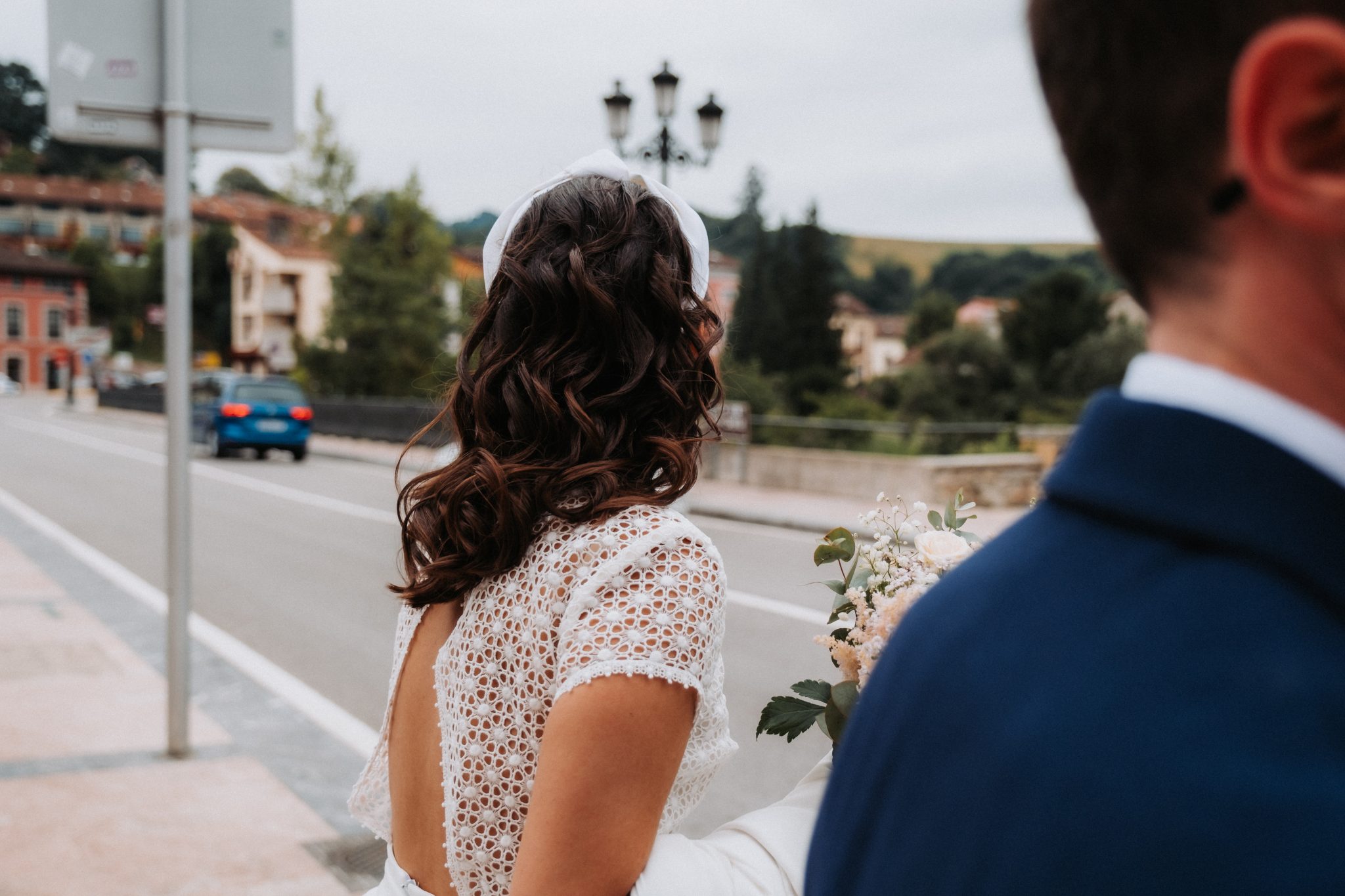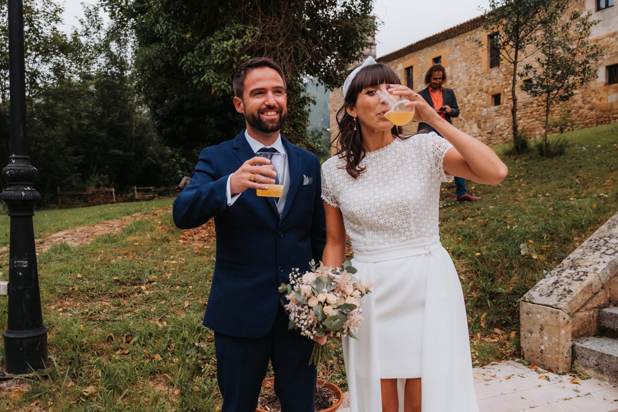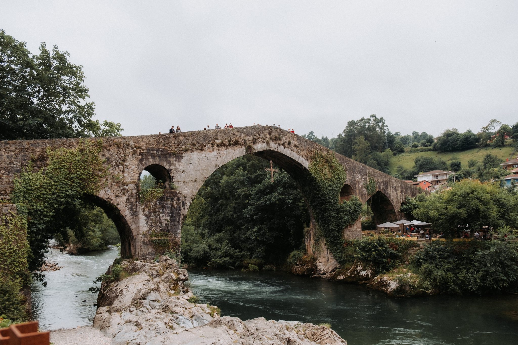 Entre medias del cóctel y la cena, hicimos una escapada para hacer unas fotos de recién casados con el puente romano de Cangas de Onís de fondo. No me gusta robar mucho tiempo pero sí me gusta que esas fotos se hagan. No me vale lo de «no se posar», todos tenemos esa mirada y esa sonrisa que ese día sale.