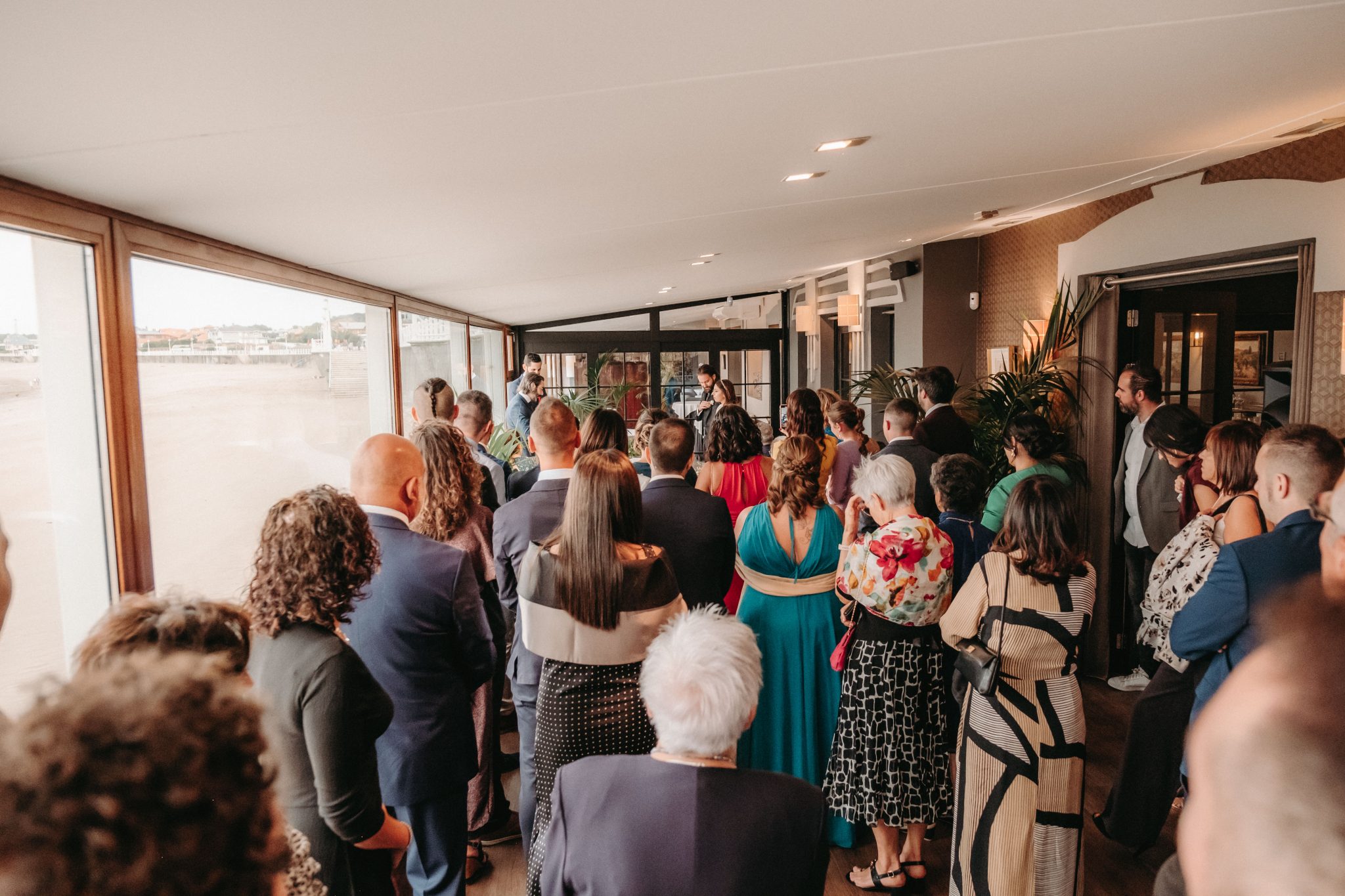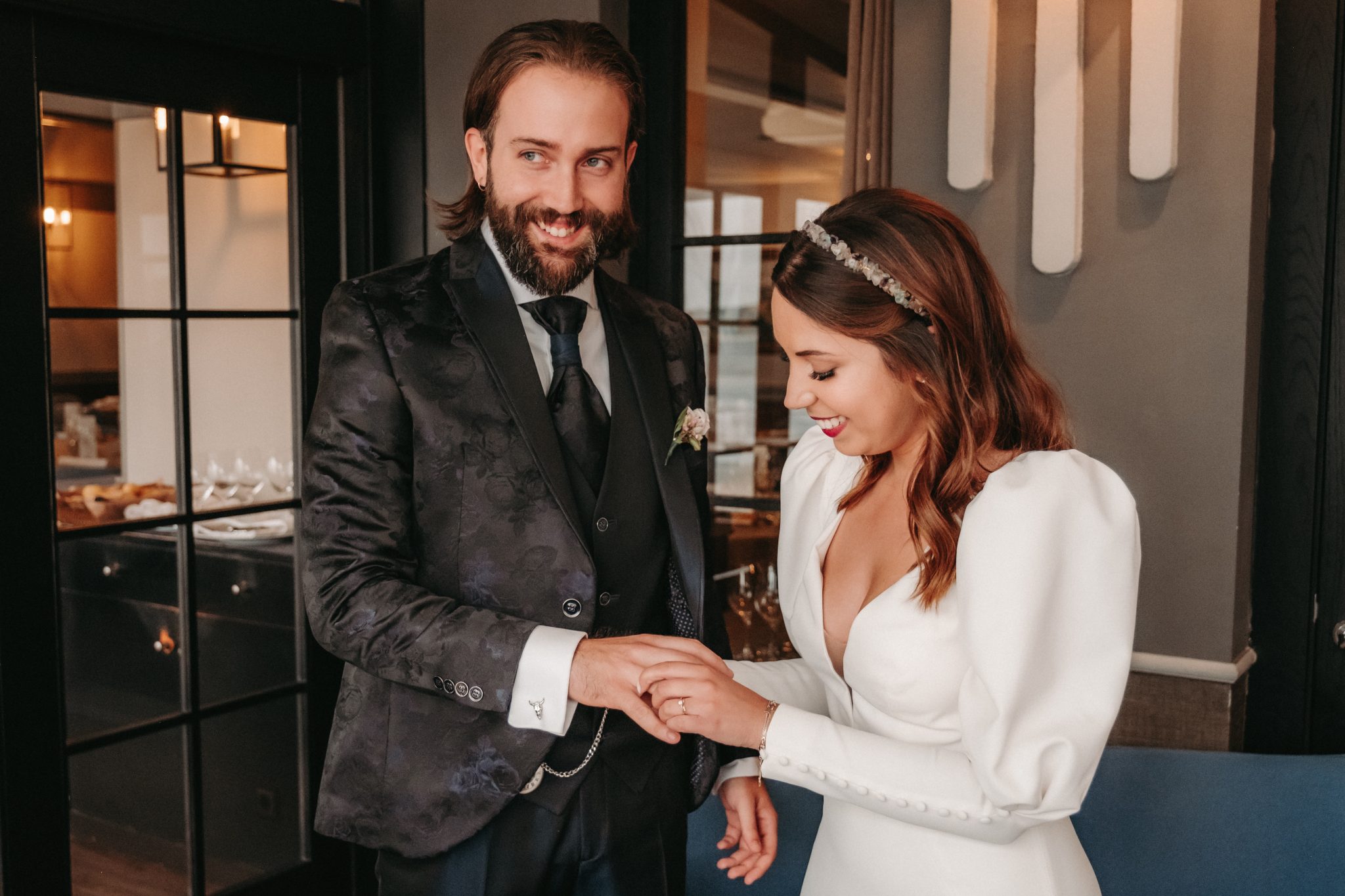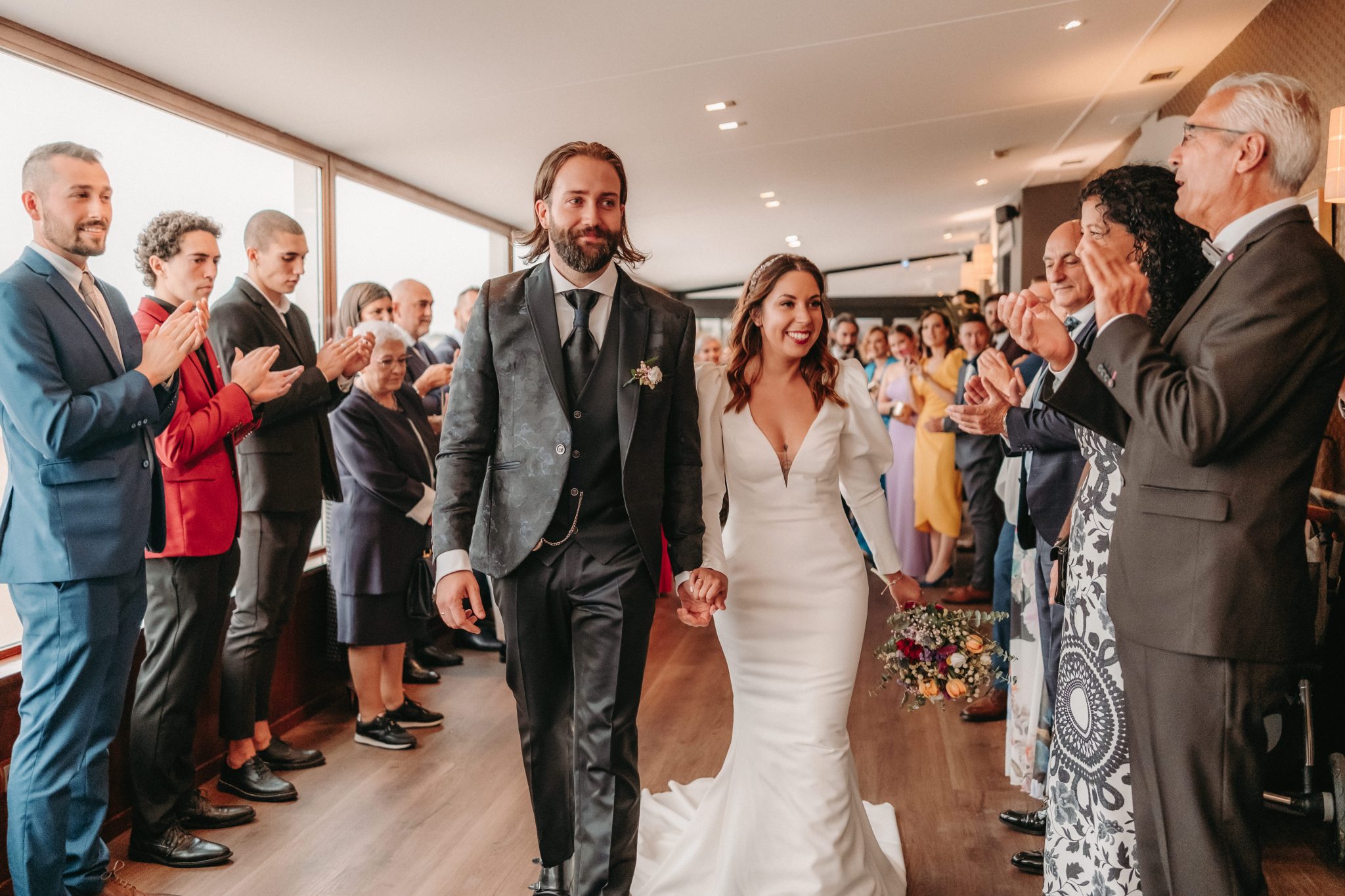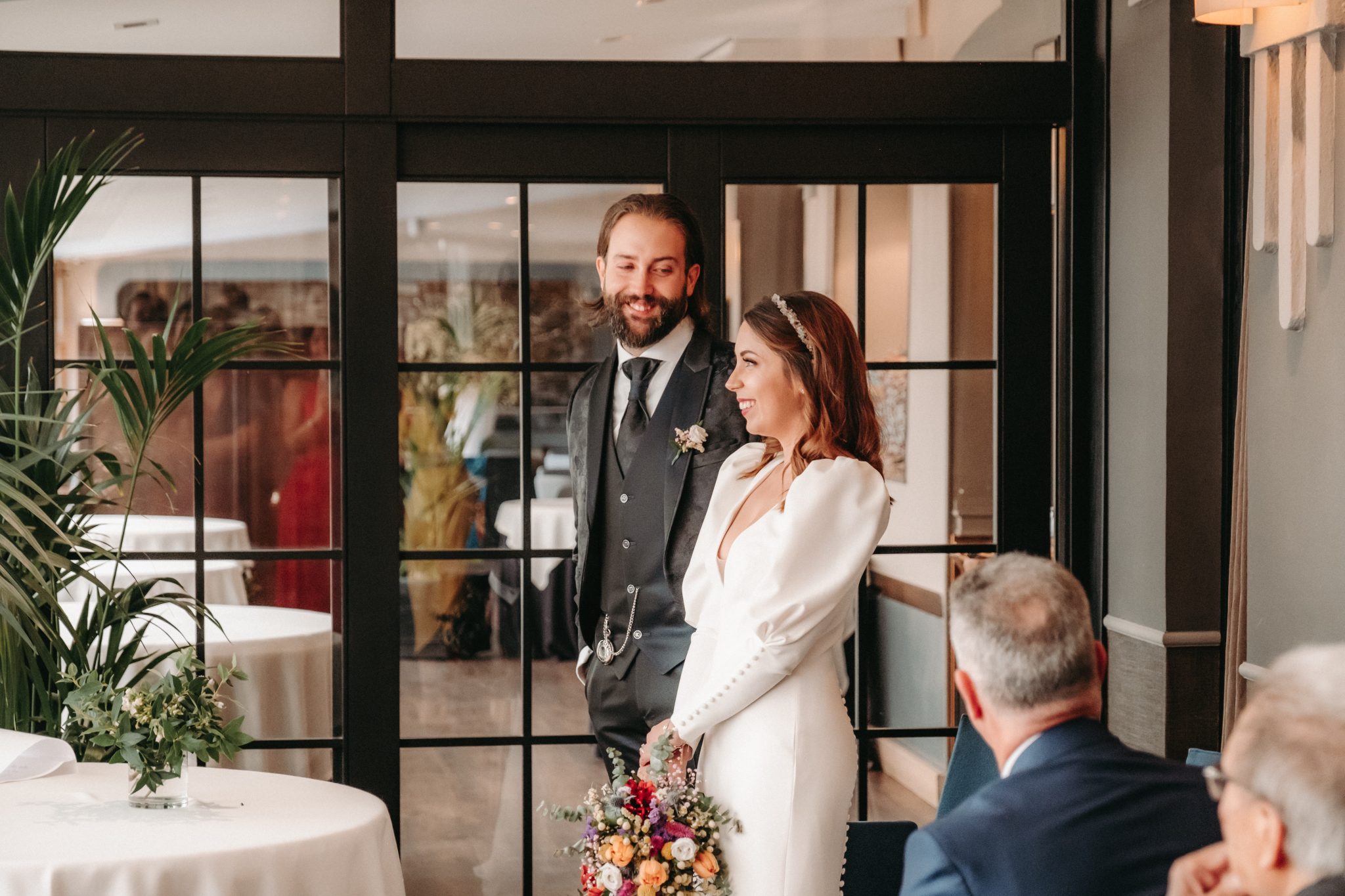 La ceremonia de esta boda en el Real Balneario de Salinas se celebró en su interior, en una sala con unas impresionantes vistas a la playa de Salinas.
