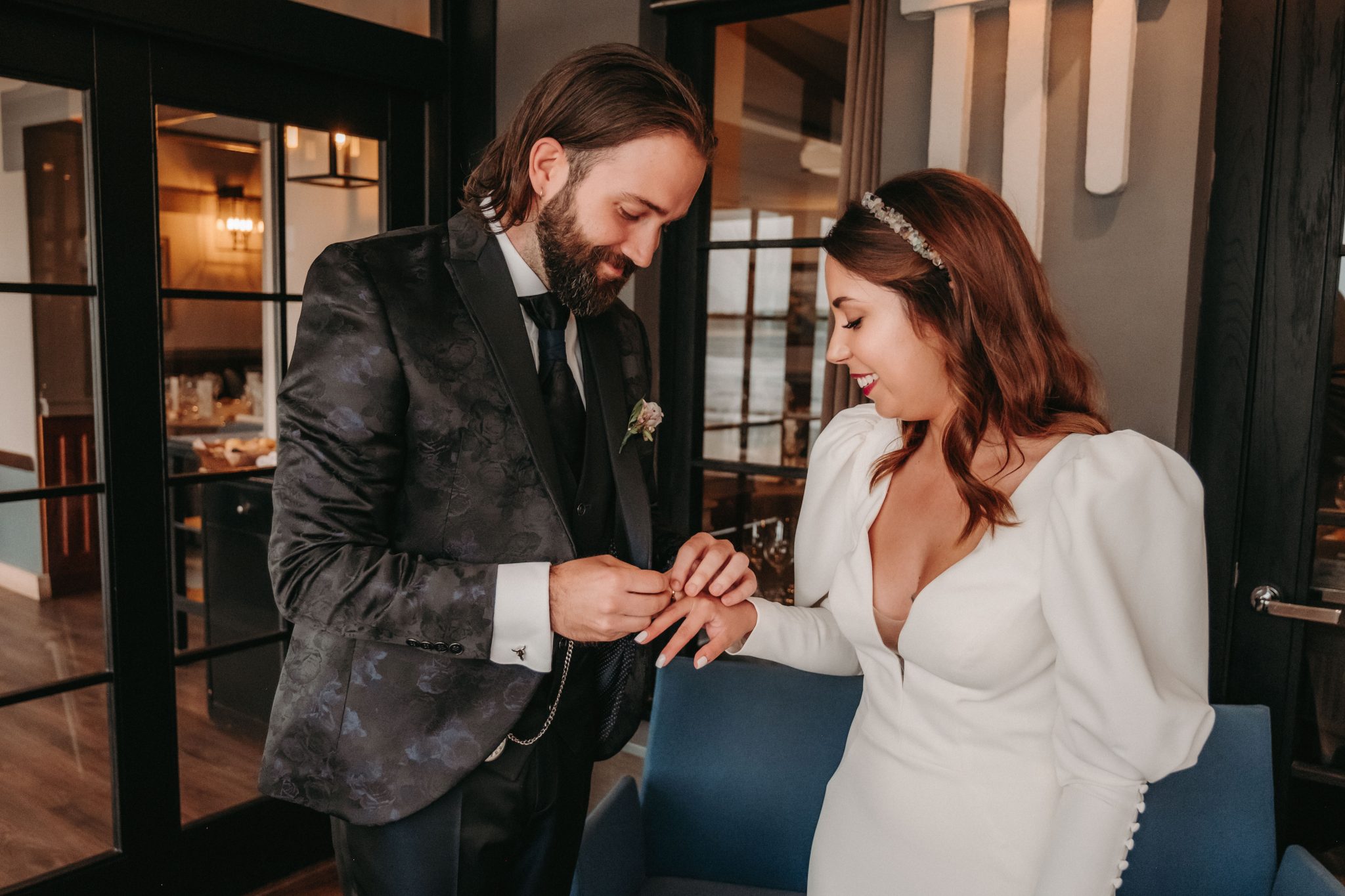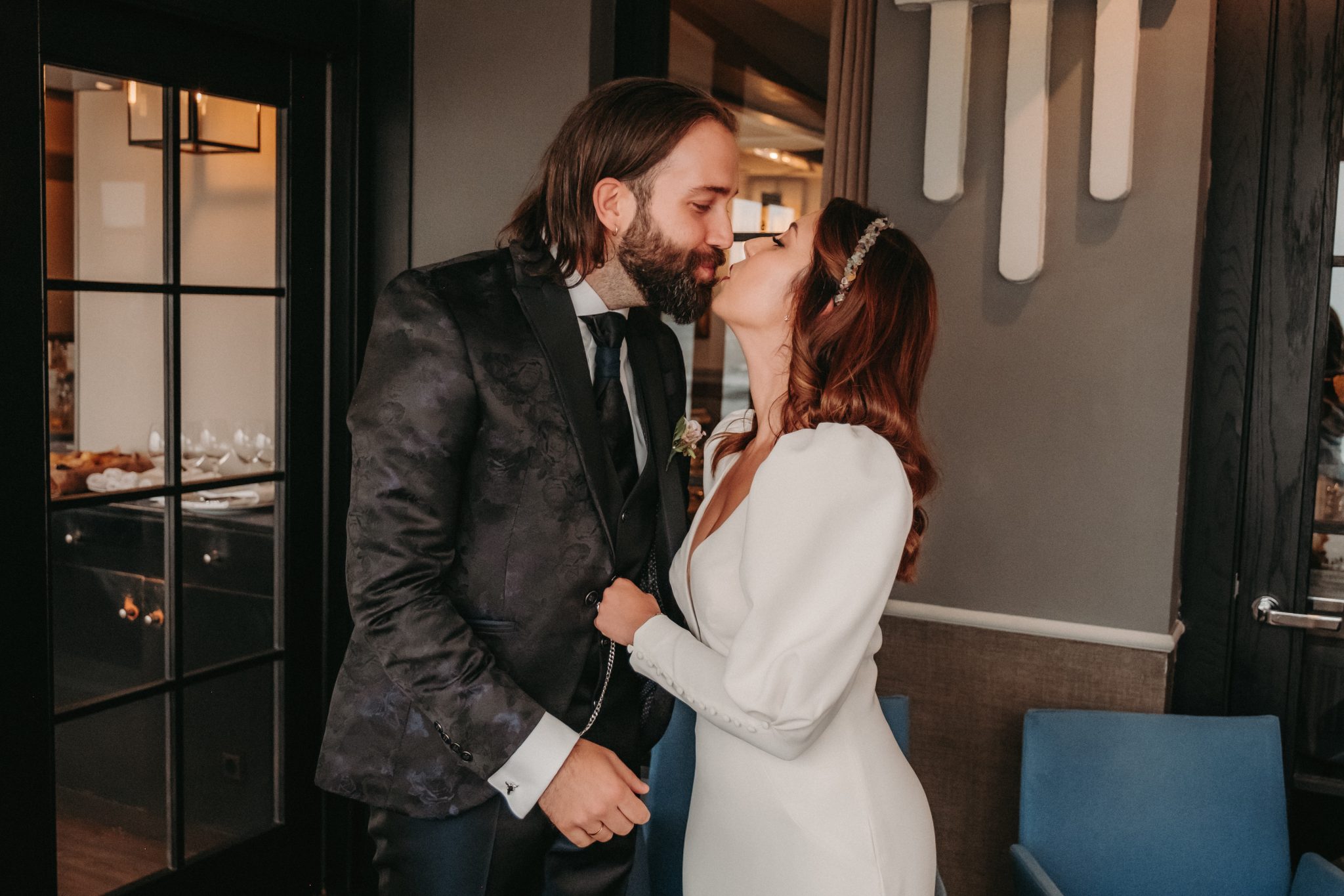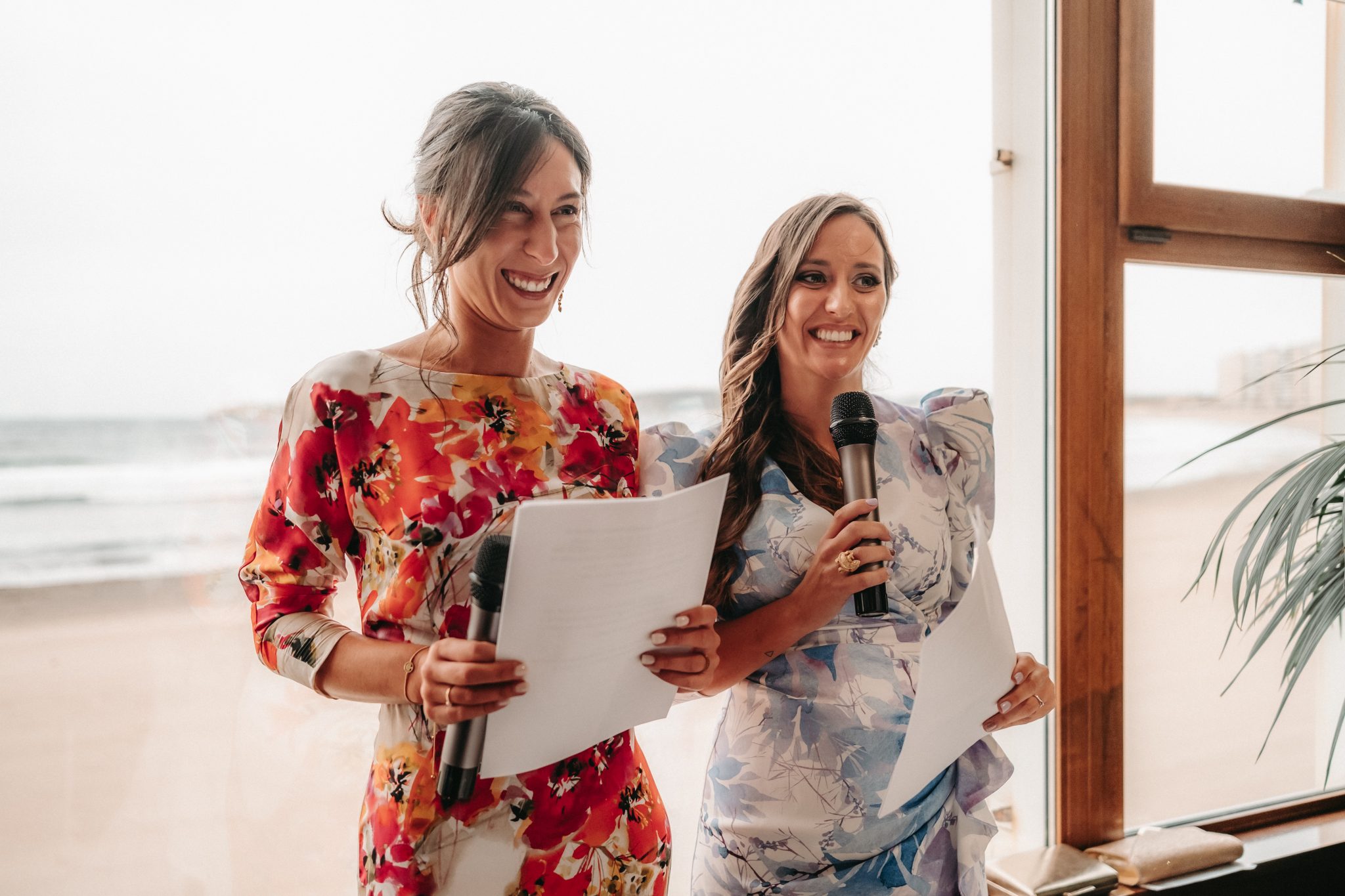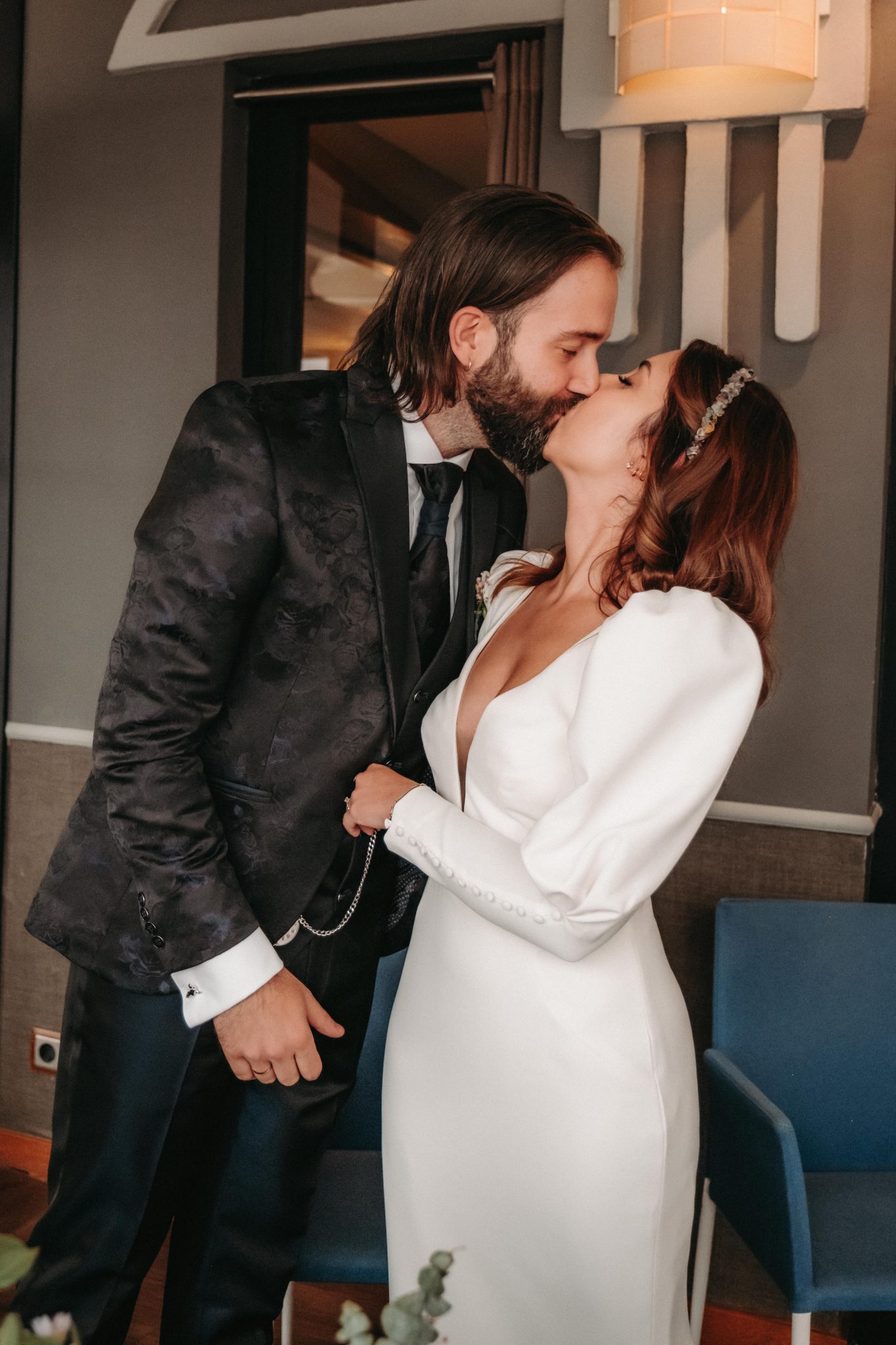 La ceremonia de esta boda en el Real Balneario de Salinas se celebró en su interior, en una sala con unas impresionantes vistas a la playa de Salinas.